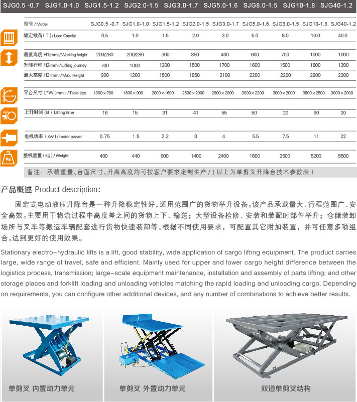 固定式電動(dòng)液壓升降臺(tái)是一種升降穩(wěn)定性好,適用范圍廣的貨物舉升設(shè)備。該產(chǎn)品承載量大、行程范圍廣、安全高效。主要用于物流過程中高度差之間的貨物上下、輸送;大型設(shè)備檢修、安裝和裝配時(shí)部件舉升;倉儲(chǔ)裝卸場(chǎng)所與叉車等搬運(yùn)車輛配套進(jìn)行貨物快速裝卸等。根據(jù)不同使用要求,可配置其它附加裝置,并可任意多項(xiàng)組合,達(dá)到更好的使用效果。